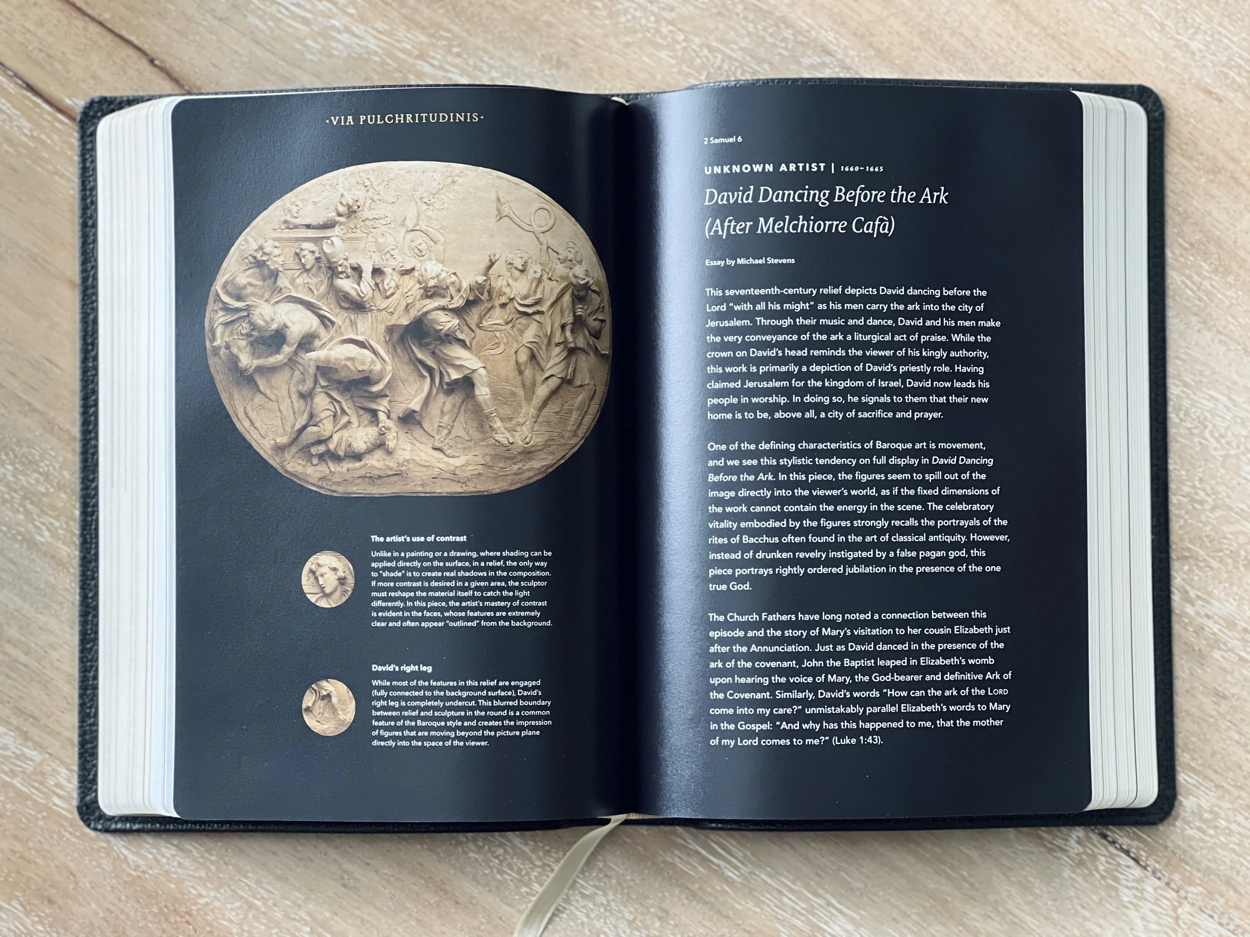 In addition to the leather edition seen here, Word on Fire also offers hardcover and paperback editions of their Bibles that are very high quality (click here to watch a comparison). Each edition features a lovely gold foil cover design representing the seven days of Creation, and they all have Smyth-sewn bindings for durability.